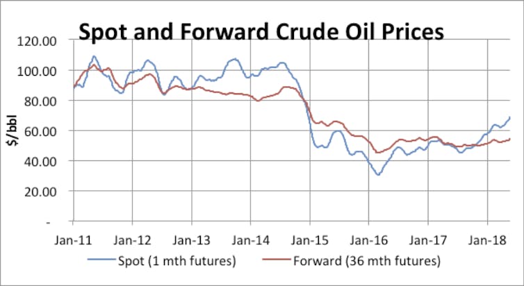 Commentary on OPEC decisions usually focuses on “spot prices” – that is, how much a barrel of oil would cost if you actually wanted it right away. But trading is also possible where we assume delivery at some specified future date, that is “forward prices”. The other way to assess OPEC decisions is to look at these forward prices – and especially at the relationship between forward and spot prices. This relationship is known as the oil market’s “term structure”.