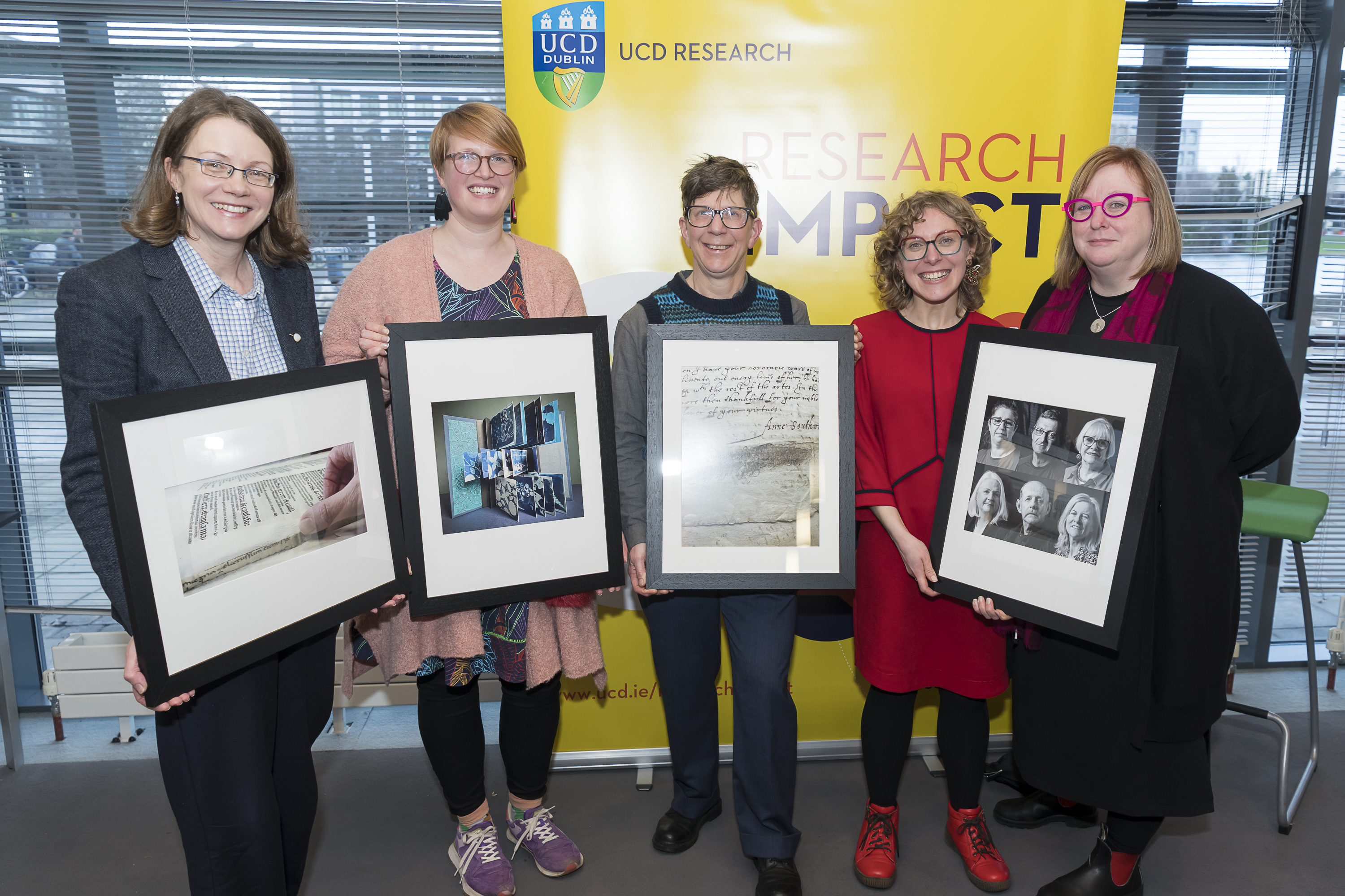 Pictured (L-R) - Dr Liz Mullins (UCD School of History), Dr. Sarah Comyn (UCD School of English, Drama & Film, on behalf of Dr Kate Fama), Professor Danielle Clarke (UCD School of English, Drama & Film), Tracey Hayes & Dr Kelly Fitzgerald (UCD School of Irish, Celtic Studies & Folklore).
