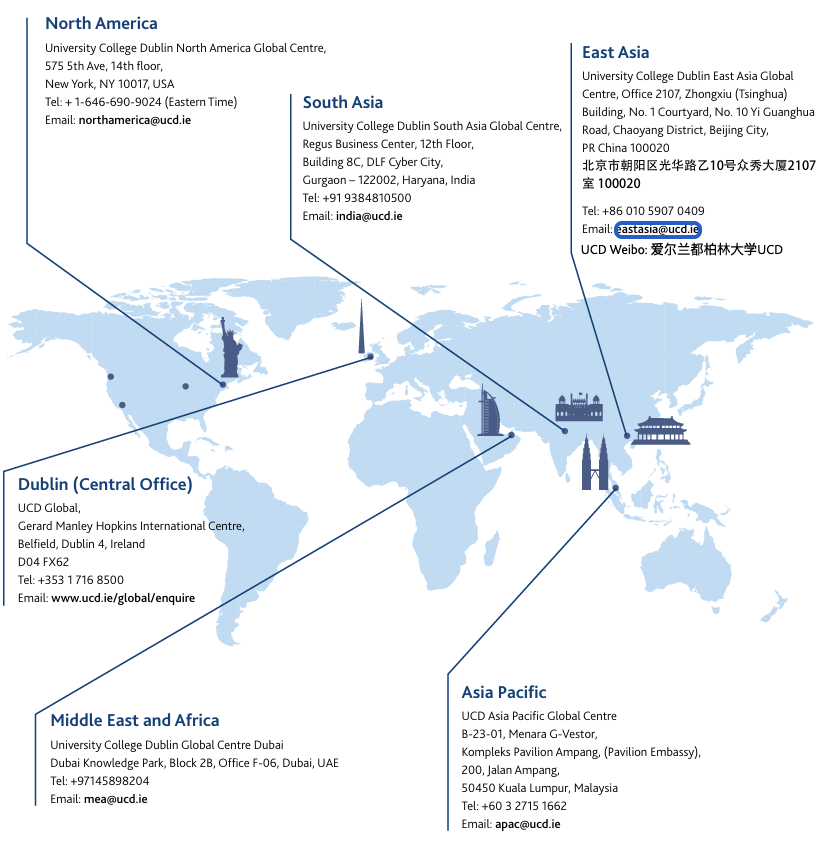 UCD has a network of Global Centres located in five countries around the world. Staffed by UCD employees, these centres are contact and information hubs for students and parents when students are making an application to UCD. Make a call, drop them an email, or even visit a Global Centre in person. Each Global Centre serves a specific region, if your country falls outside these regions, please contact our central office in Dublin at www.ucd.ie/global/enquire