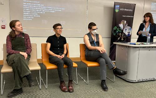 Polly was awarded the Rosalind Franklin Award in 2012 for both her scientific achievements and for her work to promote equity, diversity and inclusion in the STEM community and this award funded her documentary film A Chemical Imbalance. This short film examines why women are still under-represented in chemistry and science fields. As part of Polly's visit to deliver the 28th Wheeler Lecture the School EDI Committee and UCD Chemsoc screened the film and it was followed by a fireside chat with Polly, Evan Spotte-Smith, and Aoibheann Smyth reflecting on changes since the documentary was made in 2013. Chaired by Serena Cussen, it was an engaging conversation on the key EDI issues still at play in the field of chemistry internationally.