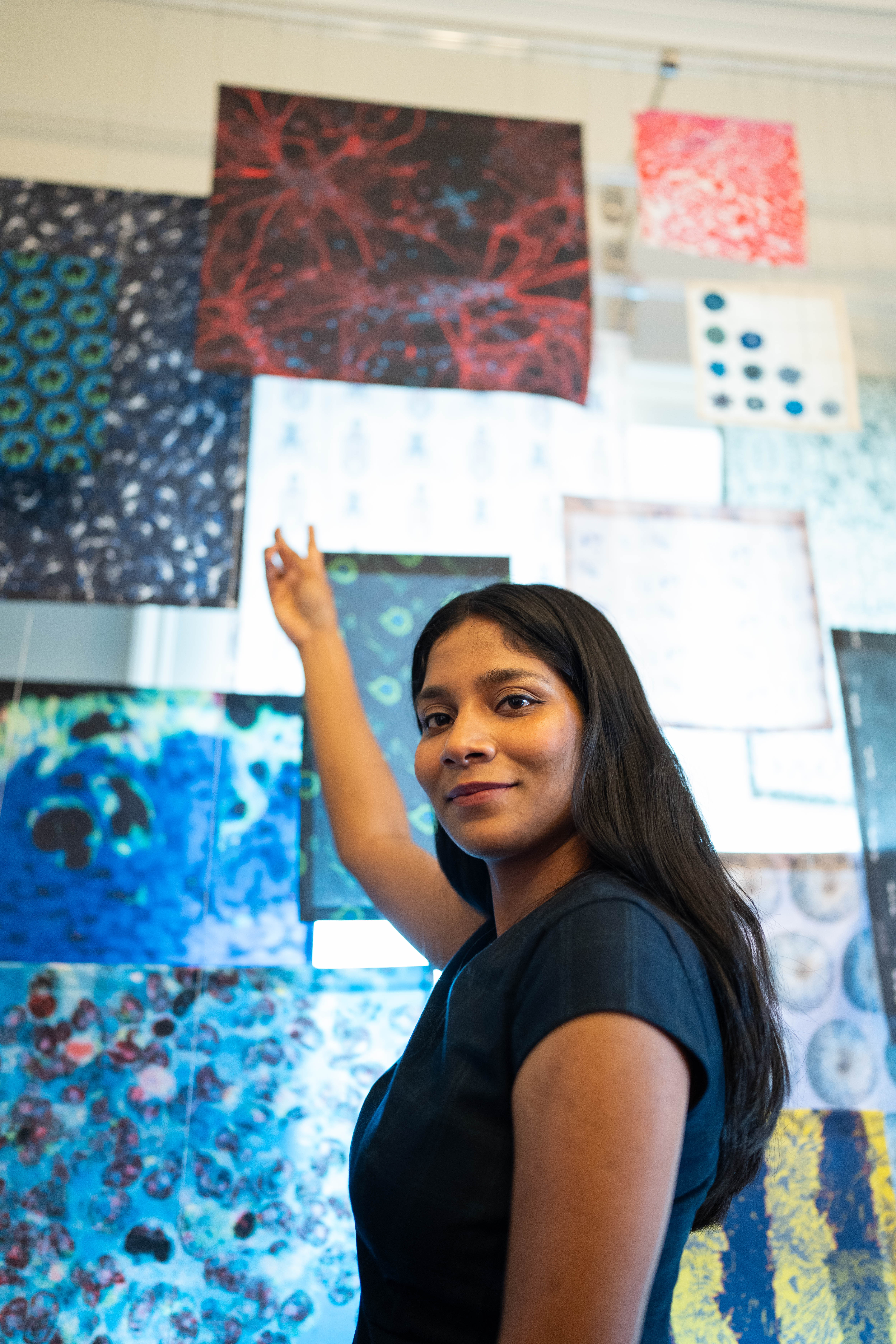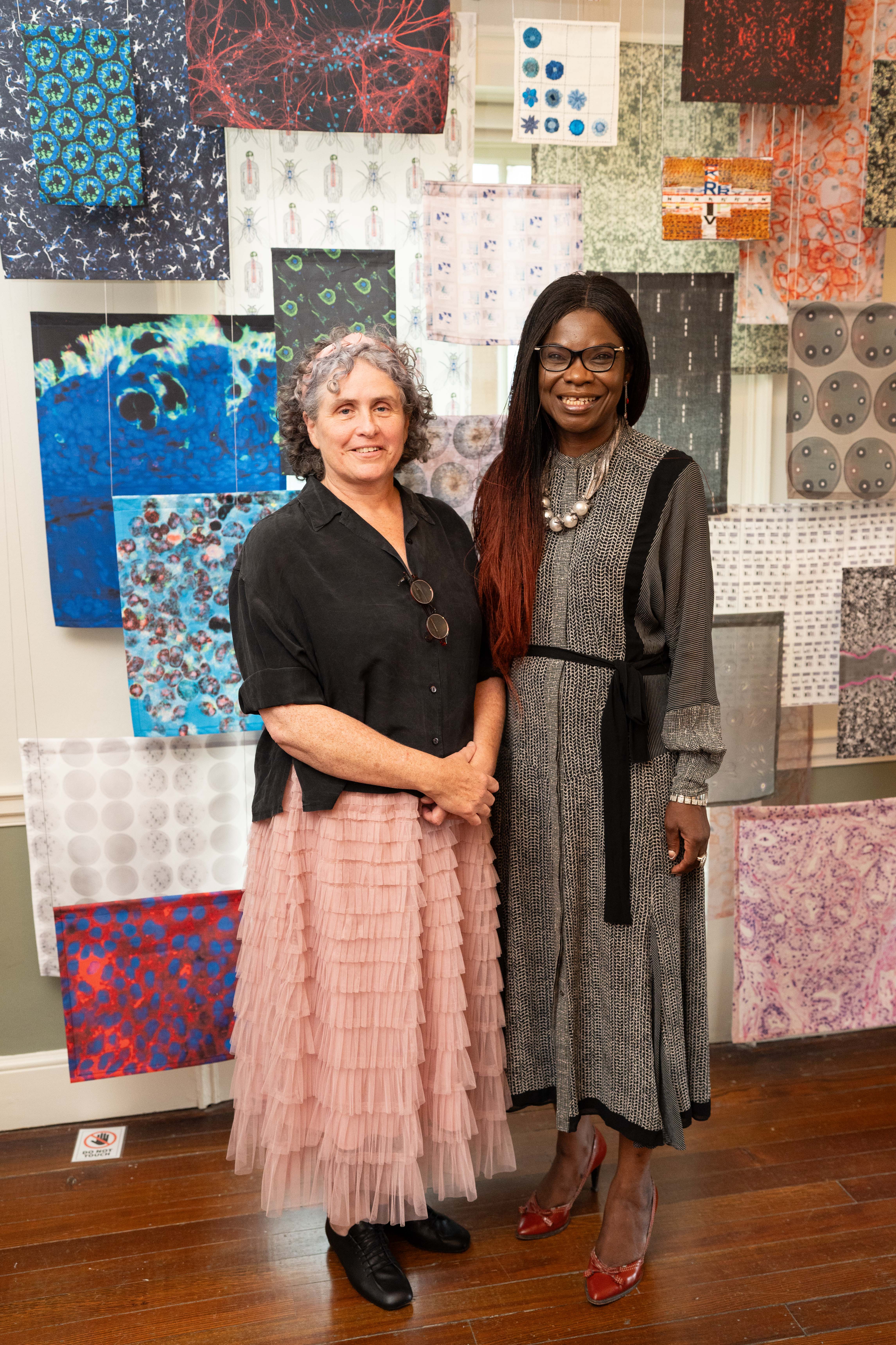 Lorna Donlon also worked with 25 females biomedical researchers to capture a representative image of their current research into diseases areas such as ovarian, prostate and breast cancer, diabetes, epilepsy, nutrition in pregnancy, bacterial vaccines, motor neuron disease, skin burn wounds, rare respiratory diseases and Alzheimer’s disease. These images were printed as patterns on different types of fabric to hang alongside the tapestry.