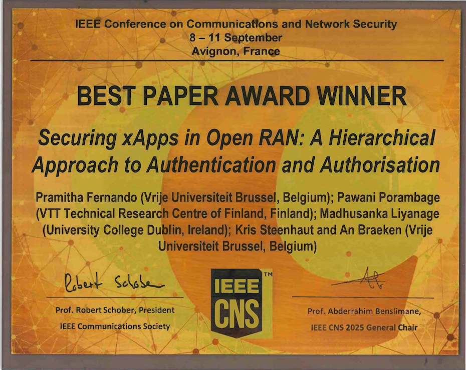 We are proud to announce that UCD (opens in a new window)NetsLab, led by Associate Professor (opens in a new window)Madhusanka Liyanage, has won the Best Paper Award at the prestigious (opens in a new window)IEEE Conference on Communications and Network Security (CNS) 2025, held in Avignon, France.