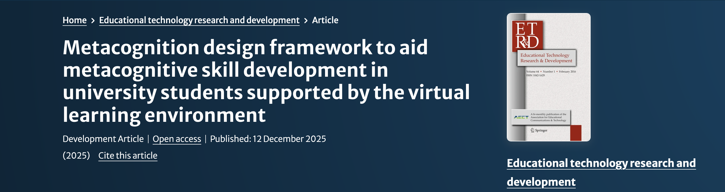 O’Neill, E.J., Fulton, C., Matthews, J. et al. Metacognition design framework to aid metacognitive skill development in university students supported by the virtual learning environment. Education Technology Research & Development (2025). (opens in a new window)https://doi.org/10.1007/s11423-025-10574-y
