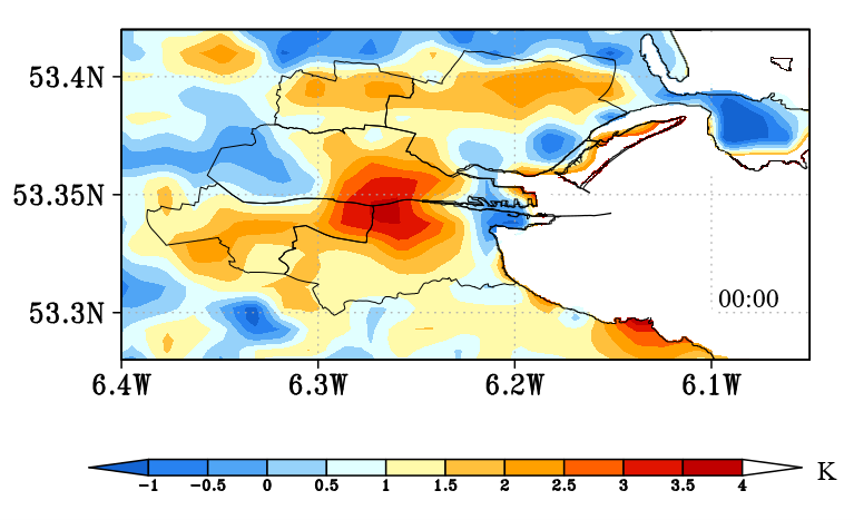 Figure 1. Dublin’s air temperature UHI during May 2018, which was an exceptionally warm and dry period. The UHI shown is simulated by the Weather Research Forecasting (WRF) model