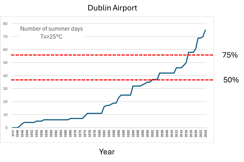 Figure 2. The number of warm (summer) days with temperatures ≥25°C at Dublin Airport. The counts are presented as a cumulative curve, starting in 1945. Half of the warm days have been recorded since 2000