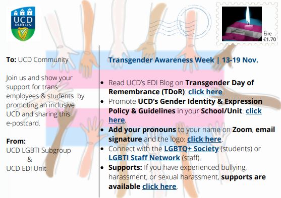 Share this e-postcard in your School and Unit with resources and supports to raise awareness about trans inclusion in UCD.