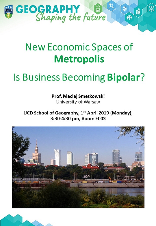 The development of the information economy and the embeddedness of the metropolis in the global space of flows have led to the emergence of new economic spaces and the transformation of city spatial structures. In the case of Warsaw, spontaneous development processes in conditions of neoliberal spatial policy have resulted in the bipolarity of business space on a scale unprecedented in most Western European metropolises. The Mokotow Secondary Business District (MOB) (a former industrial estate) concentrates around 1.3 million m2 of office space and has become the third largest non-central business district in Europe, smaller than Paris' La Defense and London's Canary Wharf, but ahead of Amsterdam's Zuidas. However, the city centre is still a better place to incubate new business entities, and this has been supported by the dynamic development of co-working spaces, of which nearly half are located in the CBD. This presentation shows the impact of these phenomena on the city’s spatial structure and the behaviours of enterprises and their employees. The findings are used to predict whether concentration or dispersion processes, including relations between central vs. secondary business districts, collective vs. corporate types of co-working spaces, and shopping malls vs. urban/festival marketplaces, will prevail in the future. Furthermore, the role of public policies are discussed in relation to the main mechanisms that shape the spatial patterns of business activity in a metropolitan area.