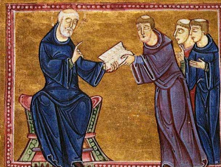St Benedict delivering his rule to the monks of his order. WikiCommons, CC BY-SA