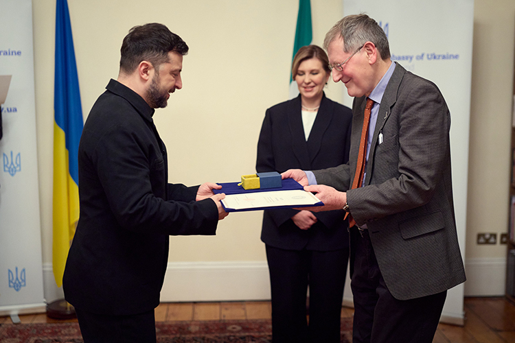 President of Ukraine, Volodymyr Zelensky, presenting a Golden Heart Award to Emeritus Professor Gerard Bury, UCD School of Medicine and UCD Centre for Emergency Services, in recognition of his co-founding the UCD Ukraine Trauma Project