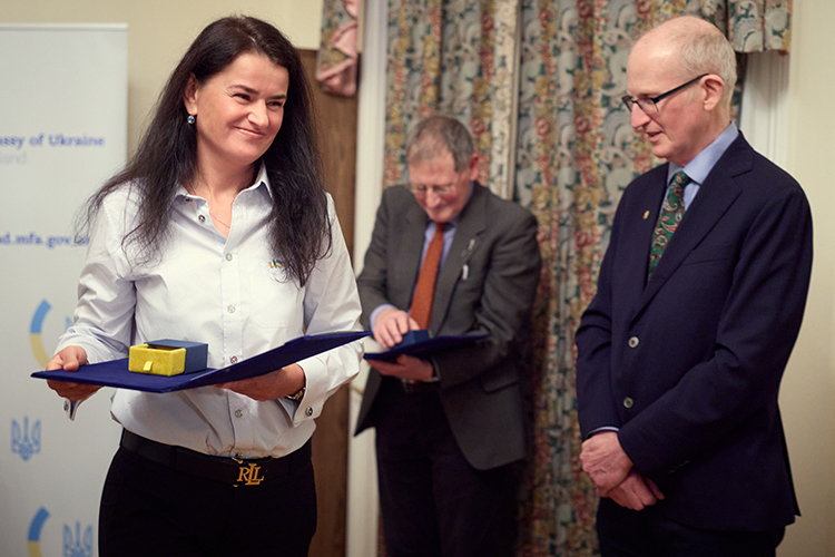 Dr Lyudmyla Zakharchenko, Emeritus Professor Gerard Bury, and Professor Chris Fitzpatrick, who were each presented a Golden Heart Award by President of Ukraine, Volodymyr Zelensky, in recognition of the UCD Ukraine Trauma Project