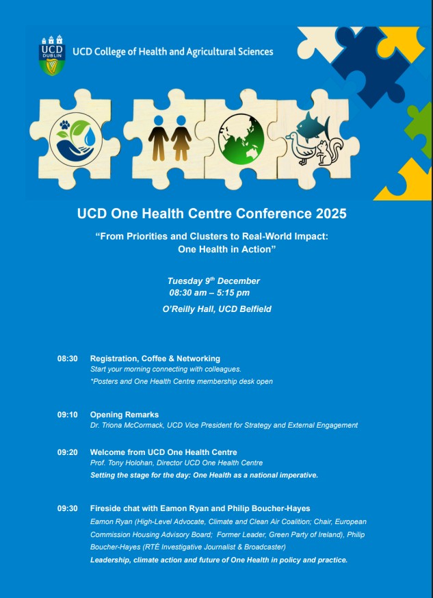 It will bring together internationally renowned speakers and will also showcase the depth and breadth of UCD and Ireland’s One Health expertise. From cutting-edge research and education to policy, public health, agriculture, and environmental action, contributors will span government, academia, civil society and international organisations.