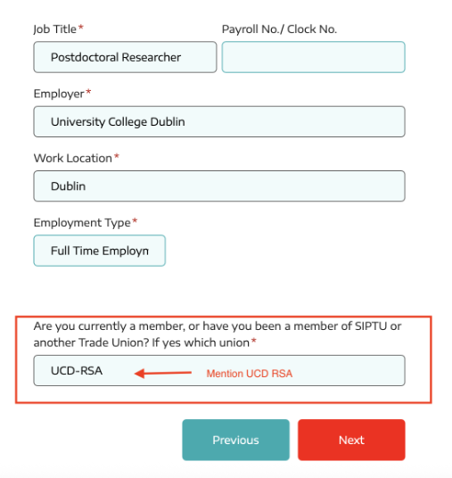 - Joining is easy: go to (opens in a new window)https://www.siptu.ie/join/ - fill in a short form and mention UCD RSA in the application (section: Job Title).