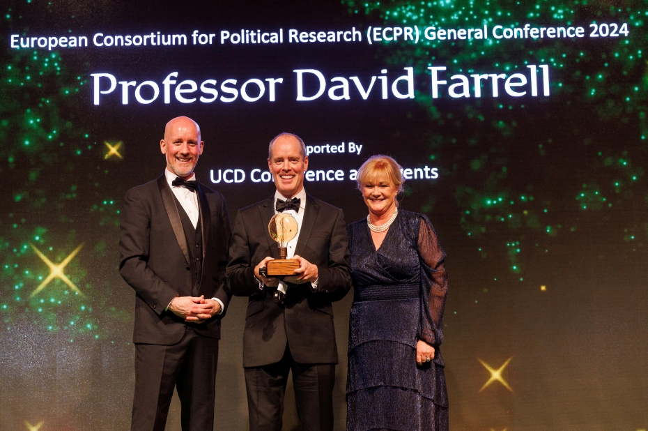 In November, Professor David Farrell was presented with a ‘conference ambassador award’ by Fáilte Ireland for his role as Chair of the Host Committee for the 2024 General Conference of the European Consortium for Political Research ((opens in a new window)https://ecpr.eu/).
