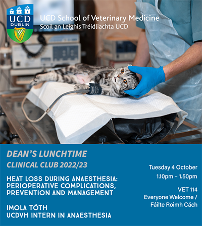 The Dean's Lunchtime Clinical Club returns for the 2022/2023 academic year on Tuesday 4 October with a presentation from Imola Toth, UCDVH Intern in Anaesthesia.